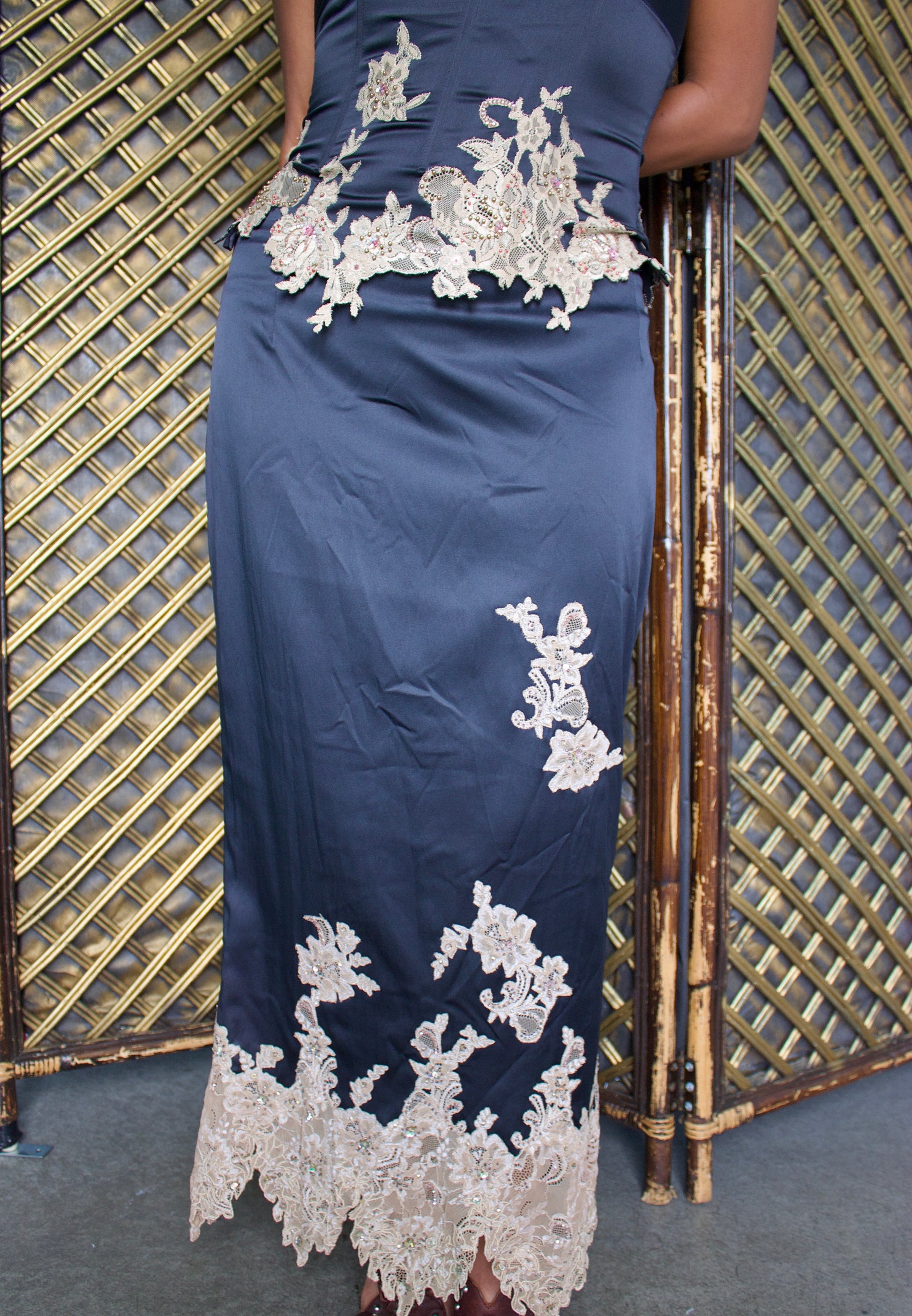The Mandalay black lace set is a vintage 2-piece set with delicate beading and lace trim. It is a unique and flattering piece with a back slit down the skirt , perfect for any occasion.