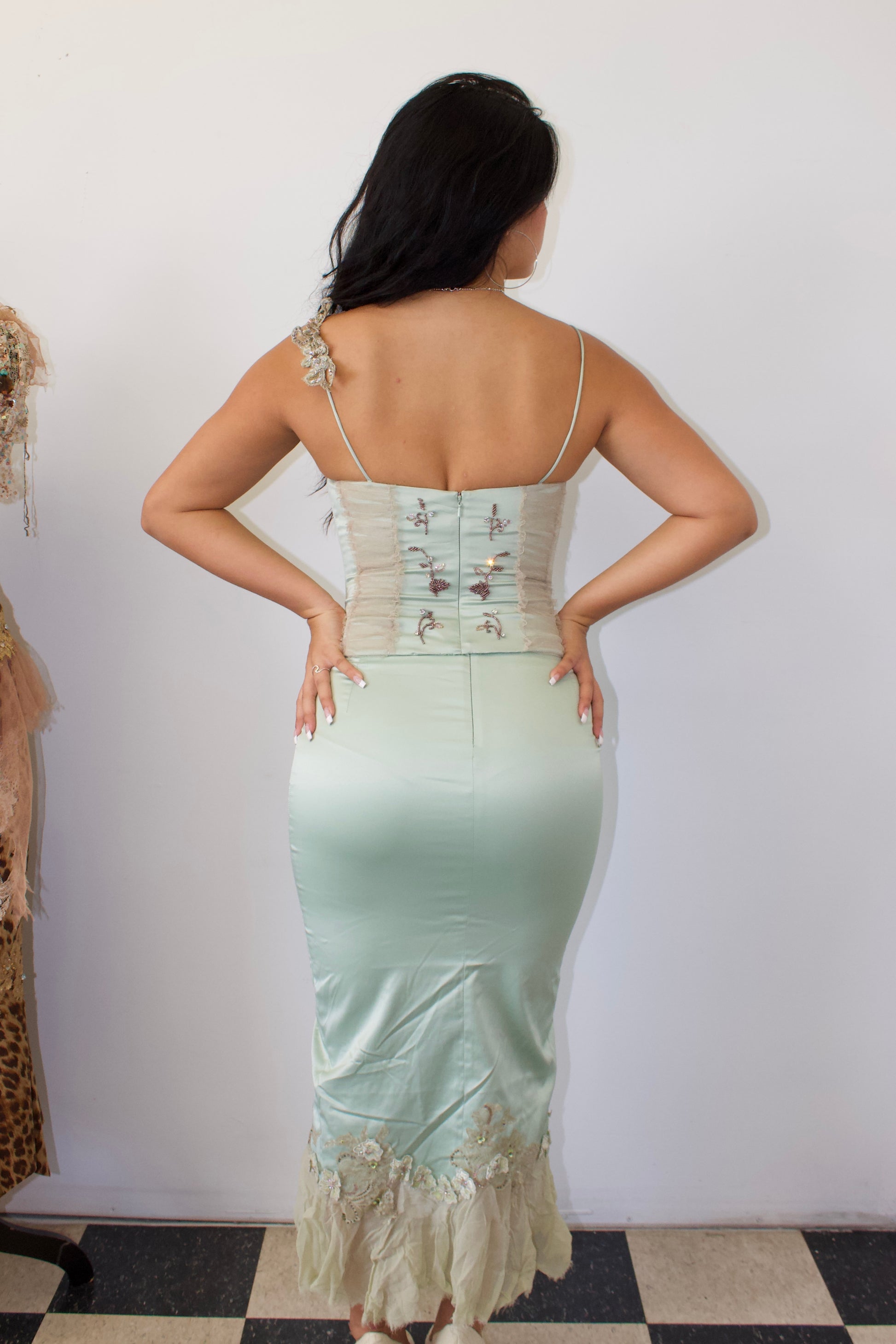 This 2 piece Mandalay mint set features exquisite lace, intricate beading, and delicate embroidery on both the top and skirt. The silk trims add a touch of elegance, giving the set a whimsical feel. The perfect fit and rarity make it a truly stunning addition to any wardrobe.