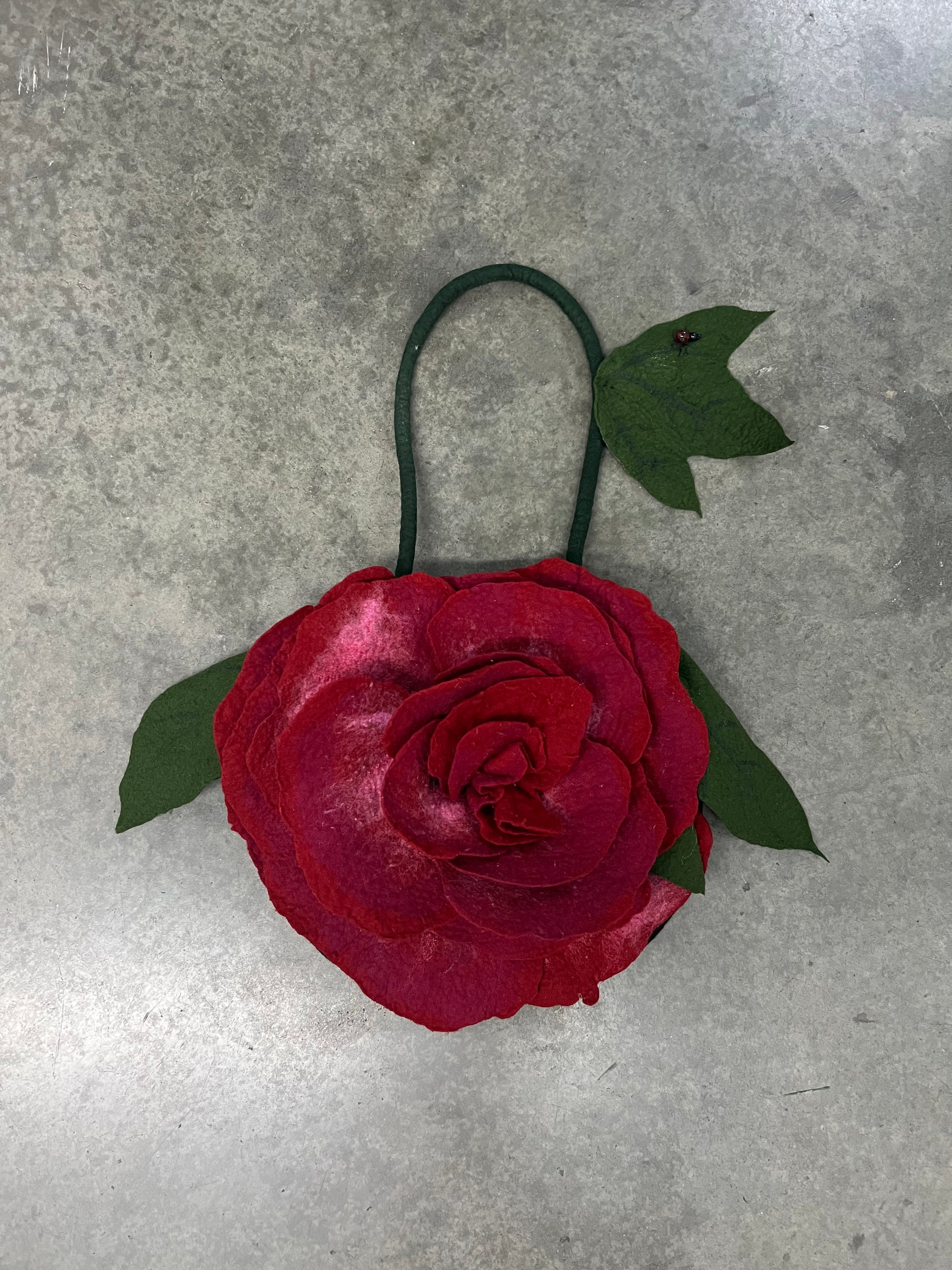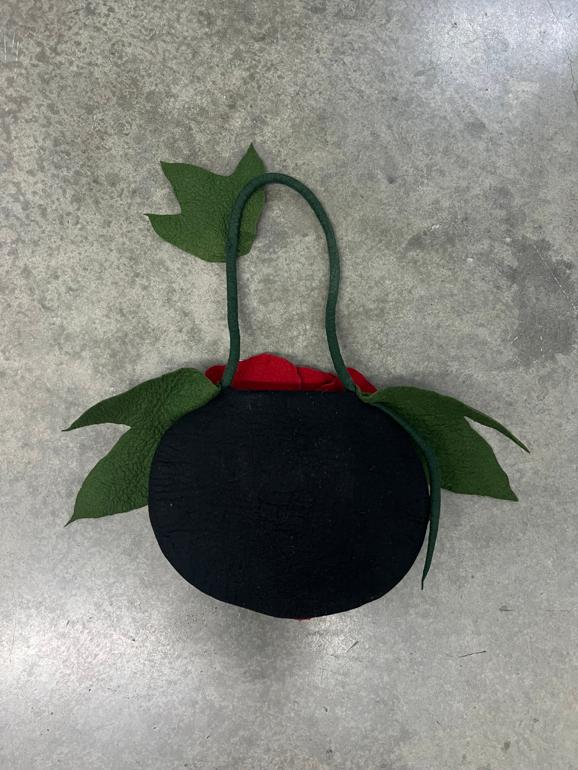 ; bag fully made from felt with the most insane detailing on the rose , has a small ladybug detailing on the leaf’s , such a fairy handbag