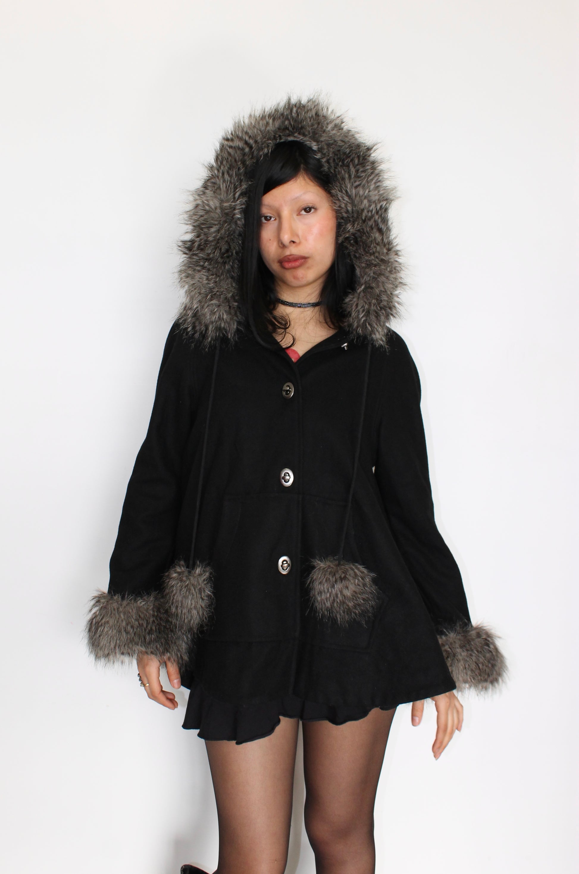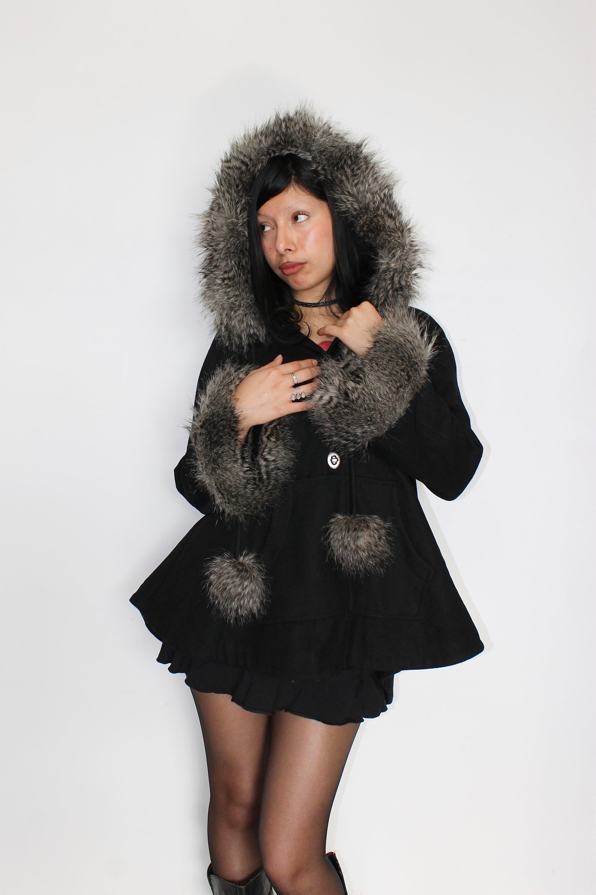 Insane vintage fur trench coat with fur trim hood & fur pom pom detailing