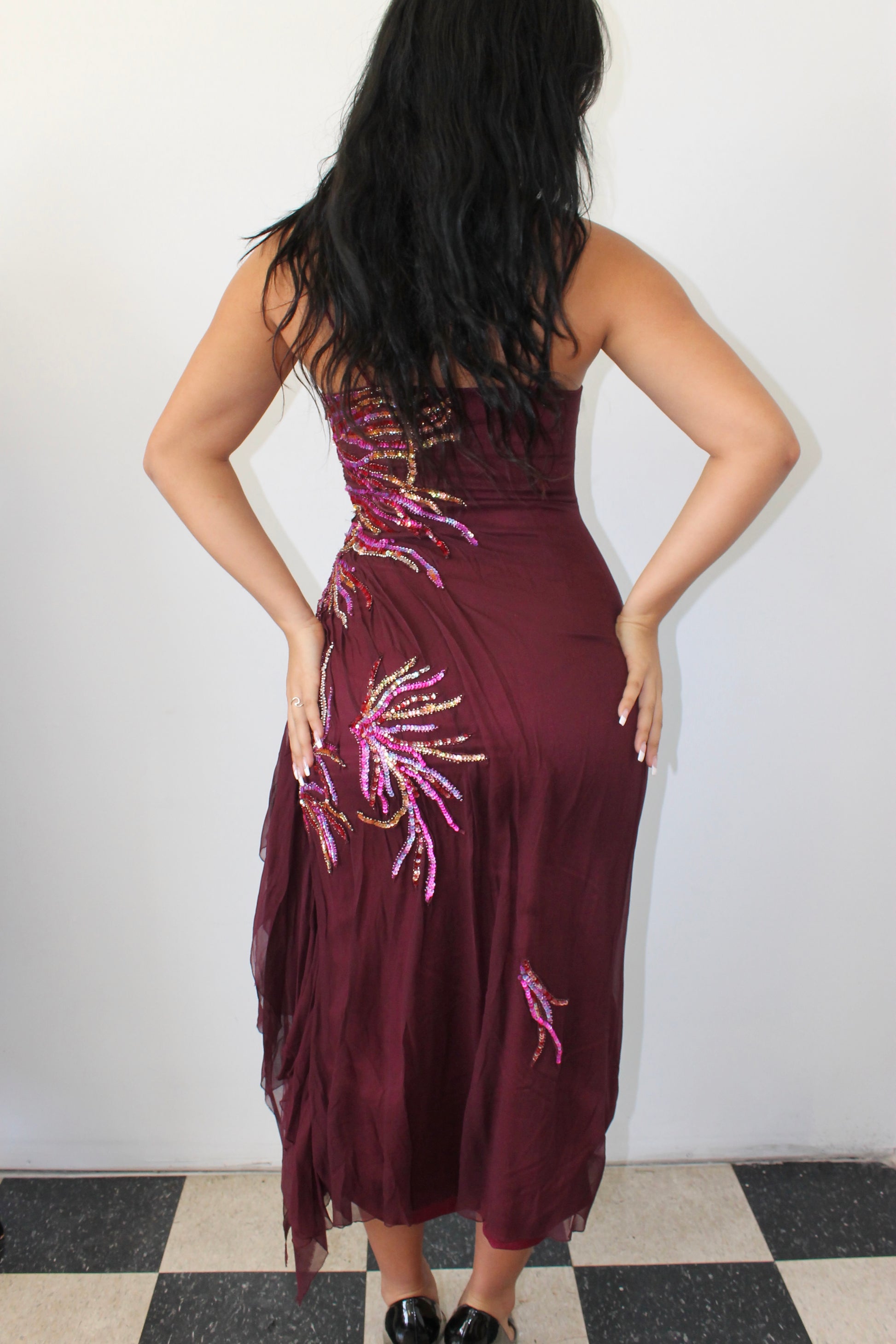 Adorn yourself in style with our Vintage Mandalay purple silk dress. This stunning dress features a flowy sheer panel on the side , adorned with intricate rainbow ray beading for a touch of elegance and sparkle. Made from luxurious silk, this dress will make you feel both comfortable and stunning.