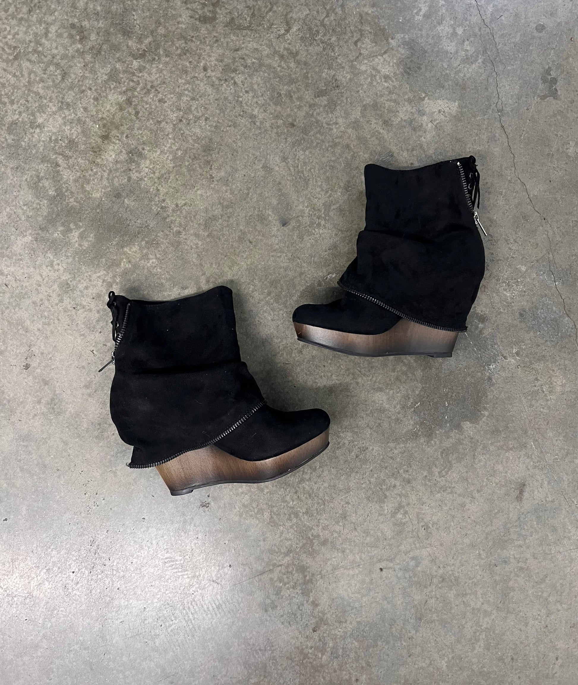 Insane vintage wooden platform wedged ankle boots with laceup detailing on the back